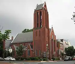The current church building, built in 1885–1886, replaced an earlier church building built in 1818. The church building was erected at a cost of $50,000 (equivalent to $1,510,000 in 2021), and it opened on October 28, 1886.[3][4] It was added to the National Register of Historic Places in 1972. The building was deemed "a very fine example of late 19th century Gothic". It has been termed a "miniature cathedral" for its "tall dominating bell tower, its stone Gothic arches and lancet windows. It is a one-story 90 by 60 feet (27 m × 18 m) structure built of red, smooth-faced brick laid in common bond, with yellow sandstane used for "window sills, buttress caps, corner blocks at gable and dormer ends, door enframements, the north gable finial and cross, gable copings for the main church and aisle dormers (though most of this stonework is covered with a protective sheet of lead), as well as the steps to the doorways."[5]