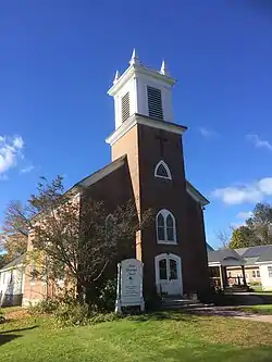 The brick church, built in the style of Greek Revival with bricks from the local Thompson's brickyard,[4] faces east and rests on a stone foundation. Two stone steps lead to a double door which is slightly pointed. There are single windows on either side. Above the doorway is a paired window at the base of a square tower of wood. The tower contains a large bell. A small narthex contains narrow, curved staircases leading to a small balcony in the rear of the sanctuary. In the sanctuary, eight sets of pews flank a central aisle, and then a set of four stairs lead to an elevated chancel with a lectern and a pulpit. A final step at the rear of the chancel holds the altar. The organ is located on the main level at the southwest corner of the sanctuary.