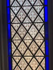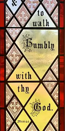 The north and south walls hold three paired pointed windows of etched and colored glass. One of these is inscribed with a biblical inscription from Micah 6:8, "And what doth the Lord require of you, but to do Justice, to love Mercy, and to walk Humbly with thy God." The others are not inscribed. The triple window behind the altar contains the lamb triumphant (Agnus Dei) and sheaves and grapes. The ceiling of the sanctuary was lowered during renovations in 1871 to its present height. Evidence of this alteration can be seen in the different colors of the brick work on the exterior of the sanctuary.[4] The roof of the sanctuary is made of metal, an unusual feature which was shared with the Congregational Church across the street, but now can be found only on one nearby house. This feature may date from the 20th century.[4]
