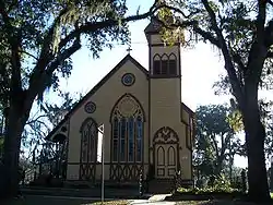 Christ Episcopal Church is an historic Carpenter Gothic Episcopal church located at 425 North Cherry Street in Monticello, Florida in the United States. Designed by T.M. Feruson of Georgia in the Carpenter Gothic style of architecture with some stick-style detailing, it was built in 1885 to replace a previous church building which burned in 1883. Its steep roof, lancet windows and side belfry and entrance are typical of Carpenter Gothic churches. The church had been organized in 1840 by local Episcopalians who had previously held lay services in their homes.[2] It is still an active parish in the Episcopal Diocese of Florida. The Rev. Mal Jopling is its current rector.[3]