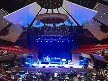 The Christchurch Town Hall, since 2007 formally known as the Christchurch Town Hall of the Performing Arts, opened in 1972, is Christchurch, New Zealand's premier performing arts centre. It is located in the central city on the banks of the Avon River overlooking Victoria Square, opposite the former location of the demolished Christchurch Convention Centre. Due to significant damage sustained during the February 2011 Christchurch earthquake, it was closed until 2019.[1] Council staff initially recommended demolition of all but the main auditorium, but at a meeting in November 2012, councillors voted to rebuild the entire hall.[2] In 2020, the town hall was registered as a Category I heritage building.