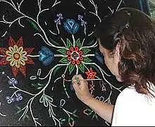 Belcourt has created large, mural-sized acrylic paintings that resemble the beadwork of her ancestors and community, by using her brush to make tiny dots that resemble beadwork. Her paintings are filled with floral designs that include insects, birds and other animals, spread out across the canvas. These are not just floral patterns or illustrations, but Belcourt has created stories for each work.[14]