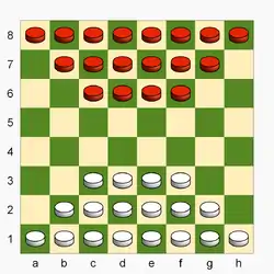 Dameo is a draughts/checkers variant inspired by International draughts and a variant of Turkish draughts called Croda invented by Ljuban Dedić. Dameo utilizes all 64 squares of the checkerboard and uses both orthogonal and diagonal movement, although capture is orthogonal only. It also introduces linear movement of men where lines of men of any length may move forward together, similar to Epaminondas or Bushka. This was added to speed play, enhance tactics, and curtail draws.[5][6] "Considerable work has already gone into analyzing Dameo, and some remarkable discoveries have been made in the area of endgame positions with just a few pieces left." [7]