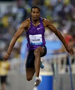 He followed his national title with a win in the triple jump at the 2011 World Championships, upsetting the field with the tenth best jump in history. He was a member of the 2012 United States Olympic team and won the gold medal in the triple jump at the 2012 Summer Olympics in London. He placed fourth at the 2013 World Championships in Athletics, but regained his title at the 2015 World Championships in Athletics. He won the gold medal in the triple jump at the 2016 Summer Olympics in Rio de Janeiro with a jump of 17.86m.[3] In 2017, Taylor once again stormed to victory in the triple jump at 2017 World Championships in Athletics with a jump of 17.68m. Coming to the 2019 World Championships in Doha as the defending champion, Taylor took his fourth world title in the triple jump by producing a 17.92m jump.