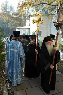 A monk's body is prepared by one of his brethren in the monastery. He will be clothed in his monastic habit and a prayer rope placed in his hands. If he was a Stavrophore or Megaloschema-monk he will be wrapped in his mandyas (cloak), from which two strips will be cut. These strips are wound around the body, so that they cross over the breast, the waist and the legs, thus symbolising not only the cross, but also the swaddling bands in which Jesus was wrapped as a baby, since the death of the body is considered to be a birth for the soul into new life.[25] His klobuk will be placed backwards over his head so that the veil covers his face. Nuns are similarly arrayed.