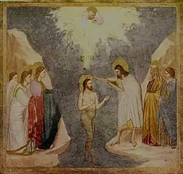Jesus was baptised by John the Baptist in the River Jordan.[33][34][35] Jesus was almost certainly naked when he was baptised. The early Christian liturgy of baptism required those being baptised to be completely naked.[36]