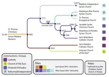 The Saint Thomas Christians (Nasrani) of Kerala primarily belong to churches which use the East Syriac Rite (Syro-Malabar Catholic Church and Chaldean Syrian Church) and West Syriac Rite (Jacobite Syrian Christian Church, Malankara Orthodox Syrian Church, Mar Thoma Syrian Church, St. Thomas Evangelical Church of India, Syro-Malankara Catholic Church and the Malabar Independent Syrian Church). The Church of South India belongs to the Anglican Communion and Saint Thomas Anglicans are theologically and liturgically similar to Anglicans elsewhere. Pentecostal Saint Thomas Christians, like other Pentecostals, are riteless (nonliturgical).[12] As of 2005, Saint Thomas Christians composed 12.5% of the total population of Kerala.[13][14]