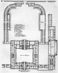 The main building stood 36 metres high with a copper-clad roof and an 84 metre high steepled tower located above the main entrance facing the show grounds. The façade was covered in sandstone and lavishly decorated with vases, reliefs, sculptures and ornamental details on cornices and window frames.[1]