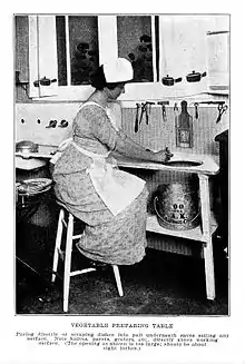 She was especially interested in making kitchens more efficient for women and is credited with bringing about standardization of the height of kitchen counters and work surfaces.[2] At the Applecroft Home Experiment Station, Frederick investigated some 1,800 different products from household appliances to food, looking for labor-saving methods of preparation and use.[3]