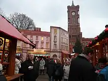 - Christmas time in Berlin at the Red Town Hall: Rathausstraße, Marienplatz, Neptune Fountain, all organised by Hans-Dieter Laubinger since 2008. Market streets in Alt-Berlin have been redesigned using six-metre-high printed tarpaulins and a skeletal structure, as a space for the market stalls. The windows on the first floor are illuminated. In addition to the shops, there are historic children's carousels and a Ferris wheel on Spandauer Street, and an ice rink around the Neptune Fountain.[13][14] Because of the excavation for the underground line U5 in front of the Red Town Hall and the reconstruction of St. Mary's Church churchyard, these markets were downsized in 2014 and it was decided to leave out the chain carousels.[7]