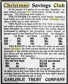 The first known Christmas Club started in 1909, when Merkel Landis, treasurer of the Carlisle Trust Company of Carlisle (Pennsylvania), introduced the first Christmas savings fund. The Club attracted 350 customers who saved about $28 each, and the money was disbursed on December 1 of that year.[1]