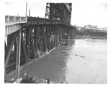 At Oregon City, Willamette Falls was unrecognizable as a waterfall, and the city was flooded by several feet of water.[3] In Portland, the lower deck of the Steel Bridge was underwater and had also been hit by a log raft consisting of around 1,000 logs.[3] The impact of the raft severely damaged the Hawthorne Bridge, closing it for a year.[3] At 12 feet (3.7 m) above flood stage, the flooding of the Willamette River at Portland in 1964 was second only to the 1948 flood that wiped out Vanport City.[3] At its peak, the water was at the top of Downtown Portland's seawall.[1]