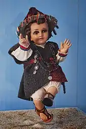 Since the colonial period, a Mexican touch has been introduced, starting with the use of Spanish moss covering the base.[4][6] The scene is missing the figure of Child Jesus until Christmas Eve. Although all the other figures are generally proportional to the rest of the scene, the figure of Jesus is much larger – almost that of a life-sized baby. This figure is not only central to the nativity scene but is also important to a tradition of bringing the figure to church on February 2 to be blessed.[4]