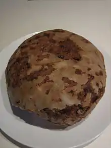 Christmas pudding's possible ancestors include savoury puddings such as those in Harley MS 279, croustades,[9] malaches whyte,[10] creme boiled (a kind of stirred custard), and sippets. Various ingredients and methods of these older recipes appear in early plum puddings. An early example of a bag pudding (without fruit) is "fraunche mele" in the Liber Cure Cocorum[11] Pudding "had the great merit" of not needing to be cooked in an oven, something "most lower class households did not have".[12] Pudding predecessors often contained meat, as well as sweet ingredients, and prior to being steamed in a cloth the ingredients may have been stuffed into the gut or stomach of an animal, like haggis or sausages.[13]