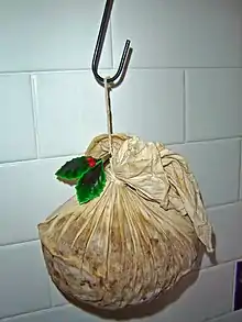 Christmas puddings are often dried out on hooks for weeks prior to serving in order to enhance the flavour. This pudding has been prepared with a traditional cloth rather than a basin.
