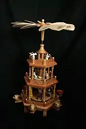 It is suggested that the Christmas pyramid is a predecessor of the Christmas tree.[1] These pyramids are not limited to Christmas: in the Ore Mountains there was a custom of dancing around the "St. John's Tree", "a pyramid decked with garlands and flowers", at the summer solstice.[2] Not actually pyramid-shaped, the Christmas pyramid is a kind of carousel with several levels, some depicting Christian motifs such as angels or manger scenes, and others with more secular motifs such as mountain-folk, forests, and other scenes from the everyday life of people in the Ore Mountains. The spinning motion of the pyramids is traditionally achieved with the help of candles whose rising heat spins a propeller above.