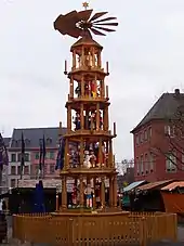 Christmas pyramids (German: Weihnachtspyramide) are Christmas decorations that have their roots in the folklore and customs of the Ore Mountain region of Germany, but which have become popular internationally. They comprise a decorated pyramidal outer frame with candle holders and a central carousel with a rotor at the top which is driven by warm air from the lit candles. The carousel is decorated with nativity scenes and other Christmas figures such as angels and wise men, as well as worldly motifs such as mining folk and forest scenes.