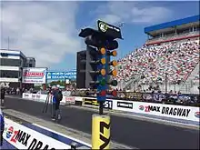 Since 1984, the NHRA officially uses CompuLink timing systems at venues on their professional drag racing circuit (includes the Christmas Tree, control units, timing sensors, cables, program software and time slip printer).[8] Many divisional tracks for both the NHRA and IHRA also use CompuLink, but current timing system manufacturers of similar operations including Accutime, TSI, PortaTree and RaceAmerica among others can be seen at various drag strips throughout the world so long as these timing systems comply to rules and regulations set forth by the respective drag racing organizations for which they are members.[9] There are still a few drag strips which continue to use the much older Chrondek timing system, although the company was sold to Daktronics in the 1980s and parts for that system are no longer made.[10][11] Most drag racing time scoreboards currently seen at the tracks are provided by Daktronics, RaceAmerica or Accutime.