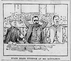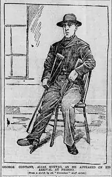 Evans was himself severely wounded at Stone Corral, having lost an eye and his left arm. He was taken into custody, but then escaped from the Fresno County Jail while awaiting his trial with the help of an accomplice, Ed Morrell. After escaping for several months in the mountains, Evans and Morrell were eventually captured after being lured into Visalia under the false belief that Evans son was deathly ill. After his surrender, Evans was convicted of murder and sentenced to life in Folsom State Prison in Folsom, California.[3] John Sontag's younger brother, George Contant, testified against Evans and hence acquired the lifelong hatred of Evans' family.