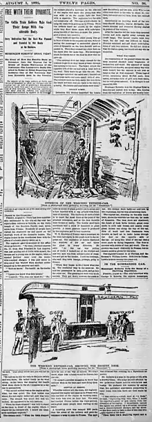 The first bomb blew the shoes off the express messenger's feet, but otherwise failed to do damage to the car. The next bomb blew the messenger into the wall and dislocated his shoulder. When the messenger refused to give the robbers the keys, he was pistol whipped and the keys taken. The three railroad men were then forced to carry the loot to the robbers buggy 200 yards away.