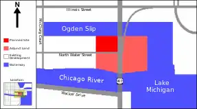The skyscraper was being constructed at 400 N. Lake Shore Drive, on Chicago's waterfront west of Navy Pier and northeast of the Loop, in the Streeterville neighborhood of the Near North Side community area. The site is at the junction of Lake Michigan and the Chicago River, and is bordered by the Ogden Slip of the Chicago River to the north, North Lake Shore Drive to the east, the Chicago River to the south, and existing residential property to the west. The site was originally zoned for two 35 to 50-story buildings.[11] Originally, it was to be sold by a joint venture of LR Development Company of Chicago and JER Partners of Virginia for $64 million to Christopher Carley of the Fordham Company.[53] After numerous short-term extensions, and later Carley's failure to obtain financing, Kelleher of Shelbourne Development purchased the land instead and pledged to finance the rest of the project.[16]