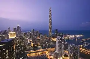 Standing at 2,000 feet (610 m), the Chicago Spire would have further transformed the always-growing Chicago skyline.[1][2][64] Plans for the tower included 1,193 condominiums with each of the building's 150 stories rotated 2.4 degrees from the one below it for a total 360-degree rotation.[65] In February 2008, prices for the condominiums were announced as ranging from $750,000 to US$40 million.[66] For supplemental structural support, each floor was to be surrounded by cantilevered corners and four concave sides.[67] Similar to the Willis Tower (formerly Sears Tower) and John Hancock Center observation decks, the Chicago Spire design included a community room on the top floor offering residents a view of four U.S. states.[68][69][70] The design for the soaring four story lobby of the skyscraper included translucent glass walls framed by arching, steel-reinforced concrete vaults.[21] The building has been described as a giant "drill bit" by the public and others in the media have likened it to a "tall twisting tree" and a "blade of grass".[19][71]