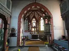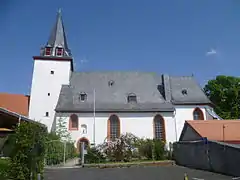 The parish became Lutheran during the Reformation in the 1540s. It separated from Camberg and had its own pastor. In 1644, Walsdorf and its church were devastated by fire, caused by Bavarian soldiers during the Thirty Years' War. The church was rebuilt from 1652 to 1663.[1] A ceiling painting by Veit Graf was completed in 1660, with references to Luther's Small Catechism.[3] An organ was installed in 1697. A crucifixion group, the altar and furnishings from the 17th and 18th centuries were donations from Walsdorf citizens.[3] In 1803, colourful glass windows were donated by Hermann Düssel, created by Centner from Wiesbaden.[3] The organ was replaced in 1858 by an instrument built by Gustav Raßmann.[1][3] The three bells date back to 1716, 1746 or 1763, and 1920.[3]