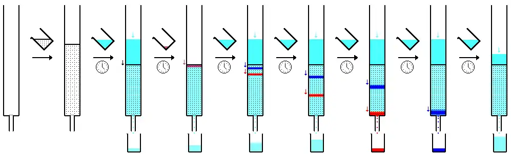 Column chromatography is a separation technique in which the stationary bed is within a tube. The particles of the solid stationary phase or the support coated with a liquid stationary phase may fill the whole inside volume of the tube (packed column) or be concentrated on or along the inside tube wall leaving an open, unrestricted path for the mobile phase in the middle part of the tube (open tubular column). Differences in rates of movement through the medium are calculated to different retention times of the sample.[13][14] In 1978, W. Clark Still introduced a modified version of column chromatography called flash column chromatography (flash).[15][16] The technique is very similar to the traditional column chromatography, except that the solvent is driven through the column by applying positive pressure. This allowed most separations to be performed in less than 20 minutes, with improved separations compared to the old method. Modern flash chromatography systems are sold as pre-packed plastic cartridges, and the solvent is pumped through the cartridge. Systems may also be linked with detectors and fraction collectors providing automation. The introduction of gradient pumps resulted in quicker separations and less solvent usage.