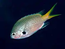 Chromis flavomaculata, commonly known as the Yellowspotted chromis, is a Chromis from the Western Pacific. It occasionally makes its way into the aquarium trade. It grows to a size of 16 cm (6.3 in) in length.