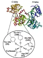 Transferrin, in addition to chromodulin has been identified as a major physiological chromium transport agent,[19][21] although a recent study found that Cr3+ in fact disables transferrin from acting as a metal ion transport agent.[22] While transferrin is highly specific for ferric ions, at normal conditions, only 30% of transferrin molecules are saturated with ferric ions, allowing for other metals, particularly those with a large charge to size ratio, to bind as well.[7][11][20] The binding sites consist of a C-lobe and an N-lobe which are nearly identical in structure.[20] Each lobe contains aspartic acid, histidine, 2 tyrosine residues and a bicarbonate ion that acts as a bidentate ligand to allow iron or other metals to bind to transferrin in a distorted octahedral geometry.[19][20][21] Evidence supporting the binding of Cr3+ to transferrin comes from extensive clinical studies that showed a positive correlation between levels of ferritin and of fasting glucose, insulin, and glycated hemoglobin (Hb1Ac) levels.[7] Furthermore, an in vivo study in rats showed that 80% of isotopically labelled Cr3+ ended up on transferrin while the rest were bound to albumin. An in vitro study showed that when chromium(III) chloride was added to isolated transferrin, the Cr3+ readily bound transferrin, owing to changes in the UV-Vis spectrum.[11][19][23] The formation constant for Cr3+ in the C-lobe is 1.41 x 1010 M−1 and 2.04 x 105 M−1 in the N-lobe, which indicates that Cr3+ preferentially binds the C-lobe.[7][19][20] Overall, the formation constant for chromium(III) is lower than that of the ferric ion.[19] The bicarbonate ligand is crucial in binding Cr3+ as when bicarbonate concentrations are very low, the binding affinity is also significantly lower.[19] Electron paramagnetic resonance (EPR) studies have shown that below pH 6, chromium(III) binds only to the N-lobe and that at near neutral pH, chromium(III) binds to the C-lobe as well.[7] Chromium(III) can compete with the ferric ion for binding to the C-lobe when the saturation greatly exceeds 30%.[20] As such, these effects are only seen in patients with hemochromatosis, an iron-storage disease characterized by excessive iron saturation in transferrin.[23]