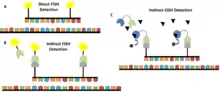 CISH also differs from FISH in the probes that are used as well as in the overall method. There are many different types of FISH probes available, such as repeat probes, probes that detect specific genes or telomeres, and probes that detect chromosomal abnormalities.[14] In contrast, there is a limited variety of commercially available CISH probes, including probes that bind the centromere of chromosomes 3, 7, 8, 9, 10, 11, 17, 18, X, and Y as well as gene-specific probes for cancer-related genes, such as HER-2, EGFR, MYC, and TOP2A.[14] Despite the limited variety of available CISH probes, they are generally more cost-effective than FISH probes.[14] With regard to the overall method, FISH can be performed using direct labelling—fluorochromes are attached to the probes—or indirect labelling—the probes are labelled with biotin or digoxigenin which are then detected using fluorescently-labelled streptavidin or antibodies, respectively.[14] CISH is performed using indirect labelling in which antibodies or streptavidin are conjugated to enzymes such as HRP or alkaline phosphatase (AP).[14]