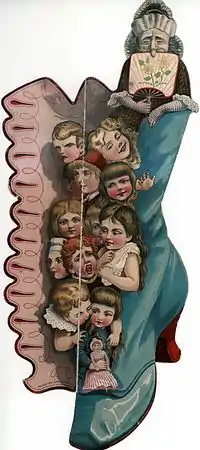 The first American chromolithograph—a portrait of Reverend F. W. P. Greenwood—was created by William Sharp in 1840.[7] Many of the chromolithographs were created and purchased in urban areas. The paintings were initially used as decoration in American parlours as well as for decoration within middle-class homes. They were prominent after the Civil War because of their low production costs and ability to be mass-produced, and because the methods allowed pictures to look more like hand-painted oil paintings.[8] Production costs were only low if the chromolithographs were cheaply produced, but top-quality chromos were costly to produce because of the necessary months of work and the thousands of dollars worth of equipment that had to be used.[9] Although chromos could be mass-produced, it took about three months to draw colours onto the stones and another five months to print a thousand copies. Chromolithographs became so popular in American culture that the era has been labeled as "chromo civilization".[10] Over time, during the Victorian era, chromolithographs populated children's and fine arts publications, as well as advertising art, in trade cards, labels, and posters. They were also once used for advertisements, popular prints, and medical or scientific books.[11]
