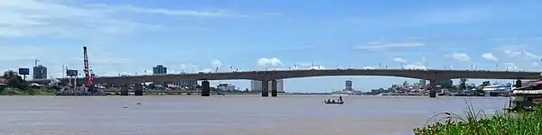 The Chroy Changva Bridge (also known as the Cambodian-Japanese Friendship Bridge) is a 709-meter bridge that crosses the Tonle Sap River in Phnom Penh, originally built in 1963, with Japanese aid. Severely damaged during the civil war in 1972 and 1973, it remained closed until it reopened on the 26th of February 1994 [1] About 10 km north of it there is another bridge the Prek Kdam Bridge, then the Prek Pnov Bridge and no more bridges on the Tonle Sap, a temporary bridge should open in April 2018, the construction of a concrete bridge should start just after that.[2]