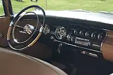 Attention to detail was evident in the standard features included. The instrument cluster continued the tradition of easy-to- read gauges with two large circular gauges with a engine turned, sometimes also called perlée appearance. The left cluster contained the odometer and a speedometer that went to 150 mph (241.4 km/h), while the right side contained an ammeter, fuel gauge, oil pressure indicator, and water temperature gauges.[20] A clock with a sweeping second hand is installed between the two directly centered to the steering column. Power adjustable swivel seats were standard but were synchronized to the opening of the door while accommodating a traditional six-way power adjustable split front bench seat, with a new "Natural Tan" leather upholstery feature called "Living Leather" that used a basket-weave pattern to promote air circulation in warm weather, while optional interior choices were available from the New Yorker list of which the 300 was based. The exterior color list was updated to offer Formal Black, Turquoise Grey metallic, Cameo Tan metallic, Copper Spice metallic, Radiant Red and Ivory White.[10] The listed retail price continued to climb to US$5,319 ($49,444 in 2021 dollars [11]) for the hardtop and US$5,749 ($53,441 in 2021 dollars [11]) for the convertible.[20]