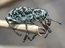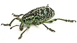 Chrysolopus spectabilis (Common names include Botany Bay diamond weevil, Botany Bay diamond beetle and sapphire weevil) is a species of weevil found in south-eastern Australia. It was discovered during James Cook's first voyage, and became one of the first insects to be described from Australia. The weevil measures up to 25 mm (1.0 in) long and includes distinctive metallic green and black scales. It is found only on 28 species of the plant genus Acacia.