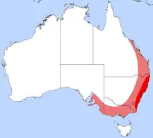Chrysolopus spectabilis occurs in the eastern and southern states of Australia, with a range stretching from the coastal region of Queensland to Victoria and eastern parts of South Australia. It is most common in eastern parts of New South Wales, particularly the surroundings of Sydney, and out to the foothills of the Great Dividing Range.