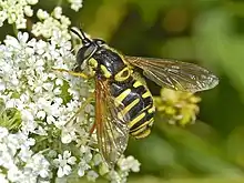 Chrysotoxum verralli can reach a length of about 8.5–10.5 millimetres (0.33–0.41 in).[4] These species is a wasp-mimic, with yellow and black bands and long antennae. These bands are substantially parallel to the front edge of tergites. The black front edge of the tergite 2 is almost straight. The third antennal segment is shorter than segments 1 and 2 together.[4] The female’s eyes are separated from each other.[5]