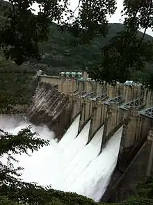 The Chungju Dam is a gravity dam on the Namhan River, 6 km (4 mi) northeast of Chungju in Chungcheongbuk-do Province, South Korea. The purpose of the dam is flood control, water supply and hydroelectric power generation. Construction on the dam began in 1978 and was complete in 1985. The 98 m (322 ft) tall dam withholds a reservoir of 2,750,000,000 m3 (2,229,461 acre⋅ft) and supplies water to a 400 MW power station.[3]