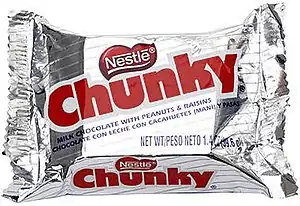 Chunky is a candy bar with milk chocolate, raisins, and roasted peanuts — using a sectioned and truncated pyramid shape. Chunky is produced by Ferrara Candy Company, a division of Ferrero SpA.[1]