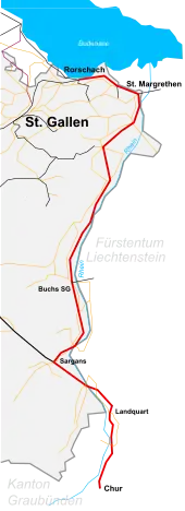 The Chur–Rorschach railway line, also called the Rhine Valley line (German: Rheintallinie), is a standard gauge railway line in Switzerland. It belongs to the Swiss Federal Railways (SBB) and is located in the cantons of St. Gallen and the Grisons.