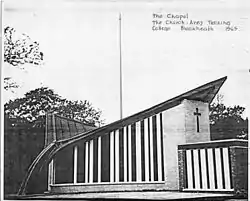The chapel was part of a larger build in 1965, and was designed to form part of the south side of an open, central quadrangle (see image of architectural model). The east side consisted of older buildings, and the west side was open, so the only other major new build was the large dormitory block on the north side. This was an international style building of white brick with metal-framed windows and black slate panels between the windows and covering the sills. Only two staircases and the upper part of the west end of this block remain in original condition, as there has been much development on the site since 1965. The description of the site in the May 1965 opening day programme is as follows: