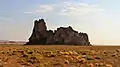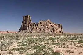 Church Rock is a pillar in Navajo County, Arizona. It is located near the mouth of Church Rock Valley with a summit elevation of 5,862 feet (1,787 m).[1] It is situated 7.5 miles (12.1 km) east of the community of Kayenta, on Navajo Nation land, and can be seen from Highway 160 as it rises 400 feet above Church Rock Valley. It is one of the eroded volcanic plugs, or diatremes, of the Navajo Volcanic Field, which is a volcanic field that includes intrusions and flows of minette and other unusual igneous rocks which formed around 30 million years ago during the Oligocene.[3]