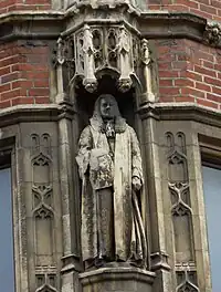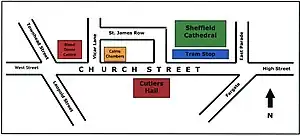 A bronze Statue of James Montgomery "The Christian Poet" stands on the Cathedral Precinct on Church Street just east of the cathedral.[6] Another significant building on the northern side of the thoroughfare is the Blood Donor Centre, a large building on the corner with Townhead street which was a Jobcentre in the 1980s. There is a Lloyds TSB bank also on the northern side of the street at number 14. Further to the west up the street on the same side at number 20 stands Cairns Chambers[7] built between 1894 and 1896. They were designed by Charles Hadfield in Tudor Gothic style for the solicitors Henry & Alfred Maxwell, the chambers have decorative exterior stonework by Frank Tory including a four-foot statue of Earl Cairns, a former Lord Chancellor. St. James Row joins Church Street on its northern side and features the buildings known as No. 1 St. James Row. Although officially on St. James Row the buildings have a substantial frontage onto Church Street and are an integral part of the thoroughfare. They were built in 1885 by Hemsoll & Smith as the Gladstone Buildings and were used as the Reform Club and offices. The buildings are grade two listed and were saved from demolition in 1976 with the interior being re-designed as offices and the exterior facade left intact.[8][9]