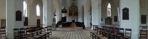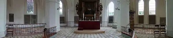 The main chapel on the north side of the church and the lower, square part of the tower are remains of a Romanesque church. In 1488 the church stood in its present form. The Catholic past of the building is heralded in a monstrance, now located to the right of the altar, and a stoup in what was then the porch.[1]