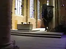 The interior was damaged by fire in 1944, but much less than the other medieval churches of the city. When the new organ was installed in 1953, the acoustics were so poor that in 1958 the city assigned Dieter Oesterlen to manage the church's refurbishment. The residual medieval plastering and the remains of the frescos were removed, leaving plain brick walls. In 1966, the French artist Alfred Manessier was charged with redesigning the 19 windows that had been destroyed during the Second World War. Inspired by verses from the Bible, he embarked first on the design of the four main windows, employing brightly coloured stained glass representations with expressive linear patterns. Together they depict various manifestations of the Word of God. At the end of the aisle to the north of the altar, the Christmas Window is inspired by "The Word became flesh" (John 1:14), while the Pentecost Window at the east end of the chancel is inspired by the Miracle of Tongues (Acts 2). The Sermon Window symbolises the preached word: "We are ambassadors for Christ" (2 Corinthians 5:20) while the Virgin Mary Window, a rose window at the opposite end of the church draws on the Christmas story: "Mary kept all these sayings, pondering them in her heart" (Luke 2:19).[2] With the assistance of François Lorin from Chartres, Manessier completed his work in 1979.[3]