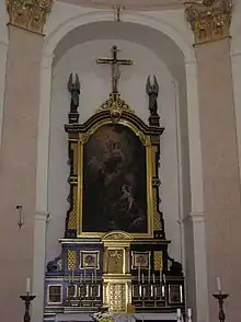 The main Neo-Renaissance altar is the work of Antonin Baum and dates to 1879, when the church interior was restored and modified. In its center is a picture of an earlier period, the work of Ignác Raab in 1760, divided into two zones. At the top is the Virgin Mary as the Queen of Heaven with angels and at the bottom are patron saints invoked against plague epidemics: St. Roch, St. Sebastian, and St. Rosalia. The background of the image depicts the horror and destruction caused by the plague.
