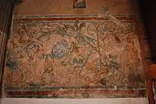 The murals on the walls of the church depict humans and animals in a European naturalist style.[10] However, unlike the static images typical of European artwork in the 16th century, the murals are distinctly alive, almost everything pictured is interacting with something else; this largely has to do with the murals being battle scenes. On the northern band of the frieze, two groups are fighting. On one side of the battle, knights wearing pre-hispanic military outfits are armed with obsidian-bladed spears, some have trophy heads, either in their hands or on their waists. On the other side of the battle, men wearing loincloths and robes are sparsely armed, some have bows and arrows and others are painted reaching for stones to throw. The contrast between the two is severe and is hypothesized as depicting the Chichimeca War.[11] The Chichimeca War was taking place during the construction of the church and was a war between the Spanish Empire (including the Otomíes) and the Chichimecas. The Otomíes are depicted as superior, with traditional military garb and the heads of their enemies in their possession, and are juxtaposed by the desperate and pathetic Chichimecas, wearing minimal clothing, with some picking up stones off the ground to use as their only weapons. The mural evokes Otomí and Christian superiority, but most importantly, it teaches Chichimeca inferiority and creates a common enemy; something crucial for unity between the Otomí and Spanish. The Chichimeca and Otomí have a history of violence, presumably, this part of the mural would have granted the Otomí a good understanding of the Christian themes of good vs evil which are at the forefront of this particular scene.