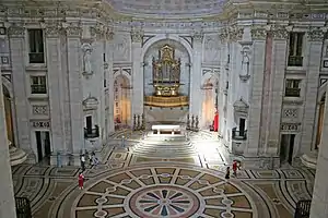 The harmonious interior of the church is dominated by the curved spaces of the central crossing and naves. The floor and walls are decorated with baroque, polychromed patterns of marble. The magnificent 18th-century baroque organ was brought from Lisbon Cathedral.