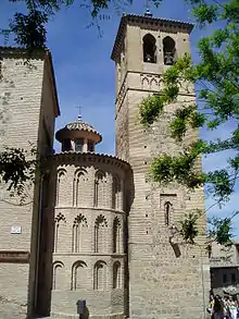 Both the present church and the tower are in the Toledan variant of the Mudéjar style and are datable, in their older parts, to the end of the 13th century. However, there is reason to assume that there existed an earlier building. The parish of "Santa Leocadia within Toledo" (see note1) is mentioned in documents from the middle of the 12th century. In the tower and on the façade of the church are preserved, embedded, some fragments of reliefs in Visigothic style.[1] There are only references to think that the primitive arrangement was that of an isolated building, separated from the Monastery of Santo Domingo el Antiguo by a street that was suppressed, in times of Alfonso X of Castile, when extending that convent.