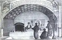 To the right of the church stood the circular parekklísion of the Ayía Sorós, which contained the dress and robe of the Virgin. The veil and a part of her belt (now at Vatopedi monastery on Mount Athos), were also kept there later. The building had a narthex and tribunes.[14] An icon of the Virgin donated by Emperor Leo I and his wife Verina was also worshipped there. On its right was kept the casket, adorned with gold and silver, which contained the relics.[14] They were rescued from the Latin occupiers in 1204, and kept in the church after the restoration of the Empire, only to be destroyed during the fire of 1434.[14][15]